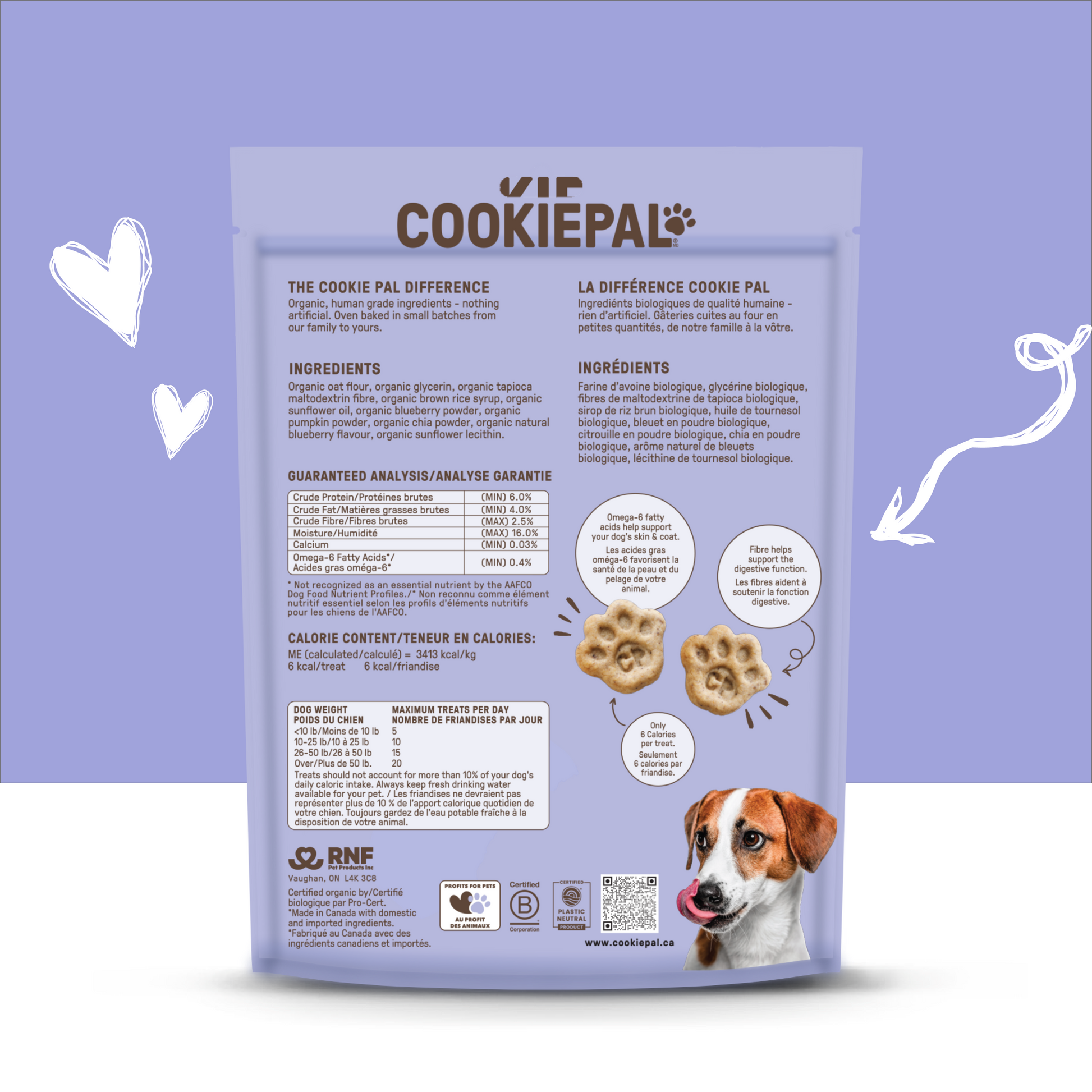 Soft Baked, low calories goodness! Just 6 calories per treat, ideal treat for training, weight management or those seniors who enjoy softer treats. Made with antioxidant rich blueberries and pumpkin which supports digestion, you know this treat is a win win on taste and benefits! Did we mention it’s amazing blueberry smell… your pup’s going to love it!