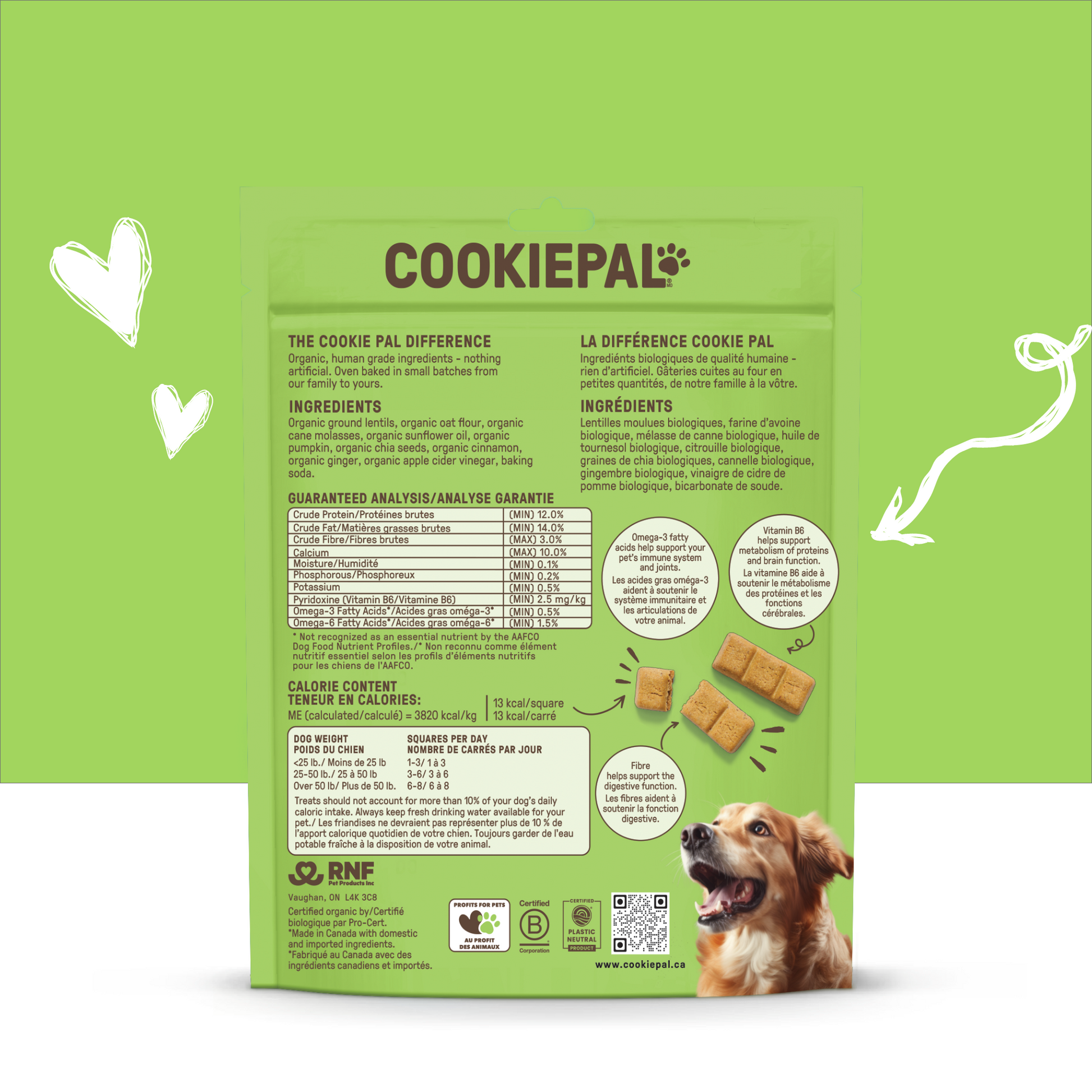 Organic ground lentils, organic oat flour, organic cane molasses, organic sunflower oil, organic pumpkin, organic chia seeds, organic cinnamon, organic ginger, organic apple cider vinegar, baking soda.